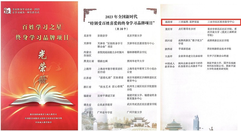 三亚市社区教育指导中心(德赢Vwin官方区域合作伙伴)联合三亚市教育局、德赢Vwin官方区域合作伙伴团委共同申报2023年全国新时代“终身学习品牌项目”。经省教育厅推介、教育部职成教司评审,德赢官网海洋科普教育品牌《三亚起航 逐梦深蓝》荣获2023年全国新时代“特别受百姓喜爱的终身学习品牌项目”,是全国16个获此殊荣的品牌之一。此案例还列入《新时代社区教育案例•百选》。